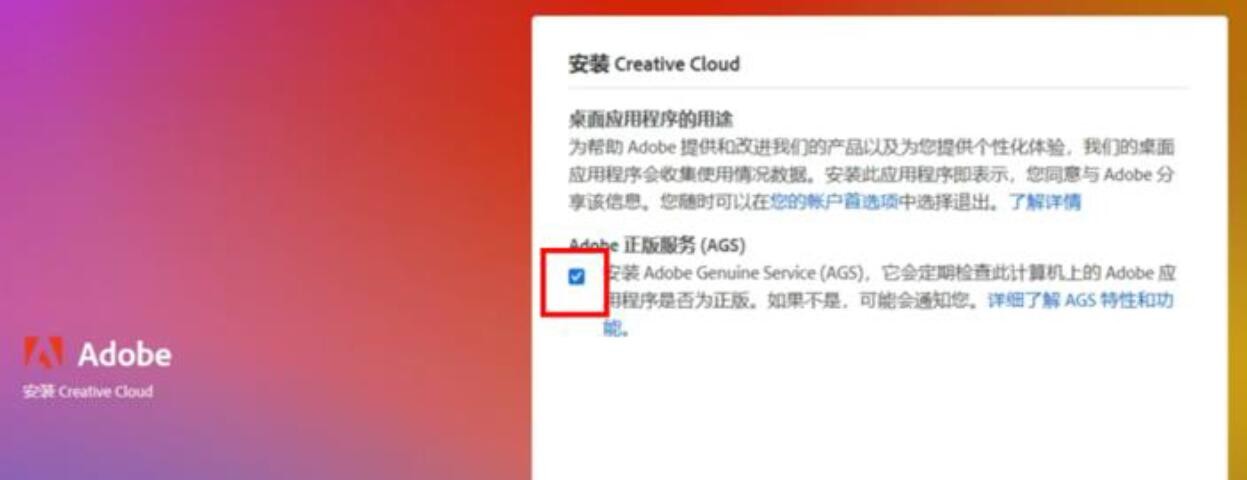 引導(dǎo)安裝需要注意:第一步或者第二步會彈出檢測 【adobe正版服務(wù) 】 這個窗口,請一定要選擇取消勾選!勾選了這個白嫖體驗就失效了。