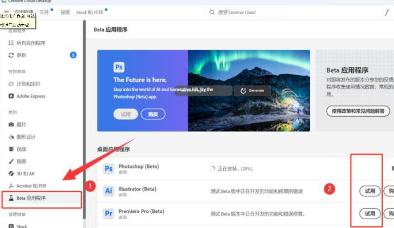 點擊左側(cè)beta應(yīng)用程序,再點擊右側(cè)photoshop(beta)試用。這時候就會開始自動安裝,我已經(jīng)點了才截圖,大家直接點PS的試用就行了的。(沒有這ps beta的話就是前面步驟出錯了,位置沒有選美國或印度)